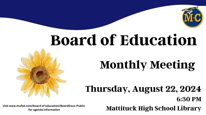 The August Board of Education meeting will be held on Thursday, August 22 at 6:30pm in the Mattituck Jr/Sr High School Library.